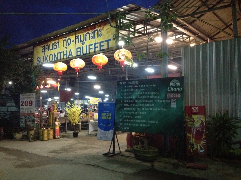 こちらが入り口。BUFFETはビュッフェ、食べ放題ですね。写真左に見える数字がお値段で、なんと一人209バーツ=約630円です。時間は無制限なので、ゆっくりたらふく食べることができます。