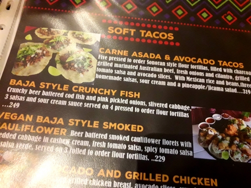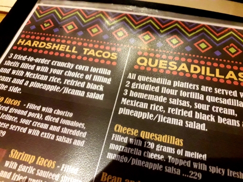 メニューは英語で、所々に料理の写真が掲載されているので、注文しやすいです。料理の名前の下に、どんなものが入っているかの説明があるので、想像しやすいのも嬉しいポイント。タコスは、ハードタイプとソフトタイプの二種類から選べます。