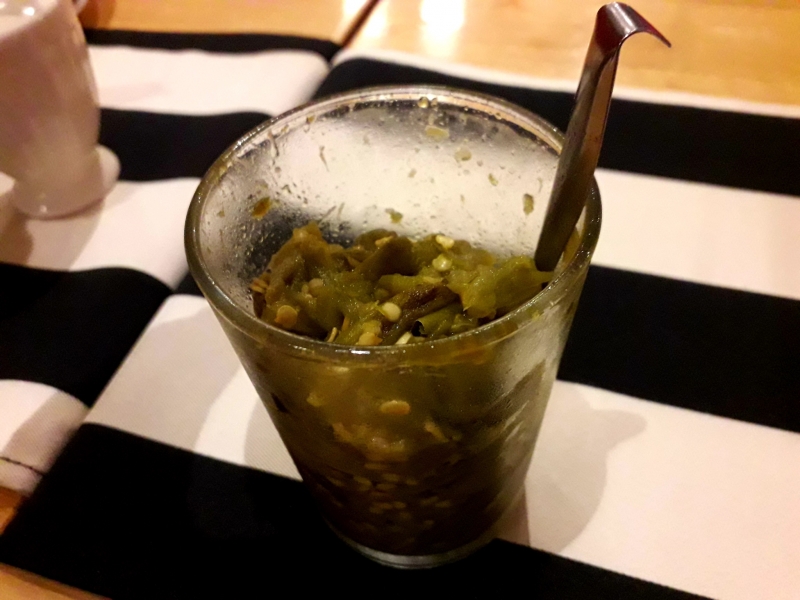 料理はそのままでもおいしいですが、お皿にのった付け合わせのサワークリームやサルサによって、様々な味の変化を楽しめます。また、テーブルにある唐辛子のピクルスを少し載せると、辛みと酸味のアクセントになって、さらにおいしくいただけます。