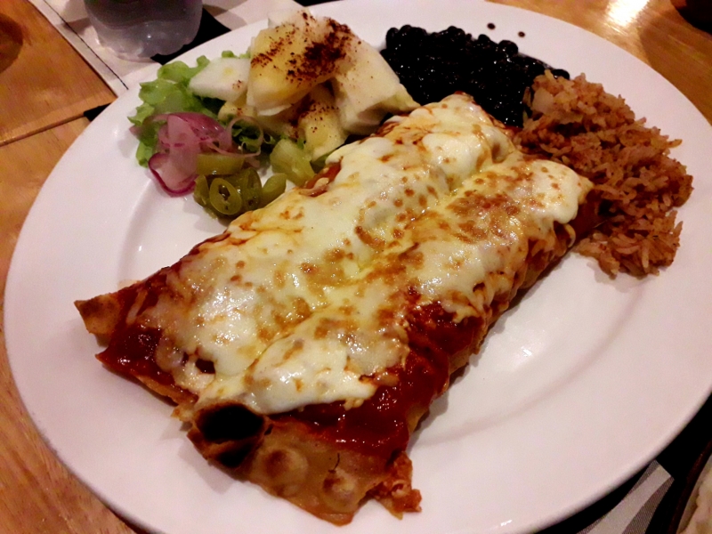 もう一品筆者が注文したのは、グーグルマップの画像を見てとてもおいしそうだと目をつけていたエンチラーダという料理。ほぐした鶏肉をトルティーヤでくるっと巻いて焼いてあります。こちらにもライスとお豆、フルーツとサルサが付いてきて、とってもボリュームがあります。チーズもとろーりと溶けて、トマトベースのソースとも相性抜群です!