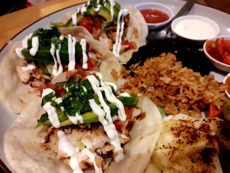 筆者がまずオーダーしたのは、ソフトタコス・アボカド&グリルドチキン。アボカドとチキンがふんだんにのったタコスが3つと、数種類のサルサ、お豆とライス、フルーツがとても華やかに盛り付けられています。