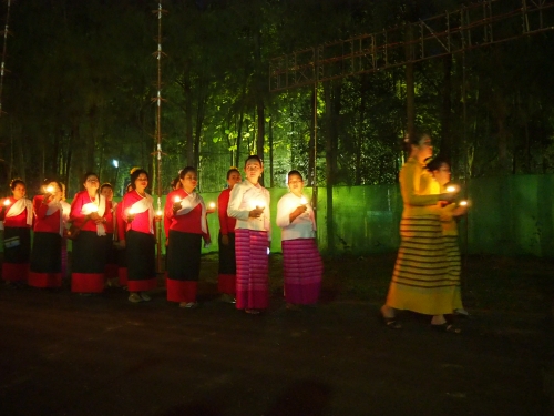 スタッフが座席前にあるロウソクに次々と火をつけて行きます。その火をコムローイの中心部についた輪っかの部分に点火し、コムローイが熱気で膨らむのを待ちます。