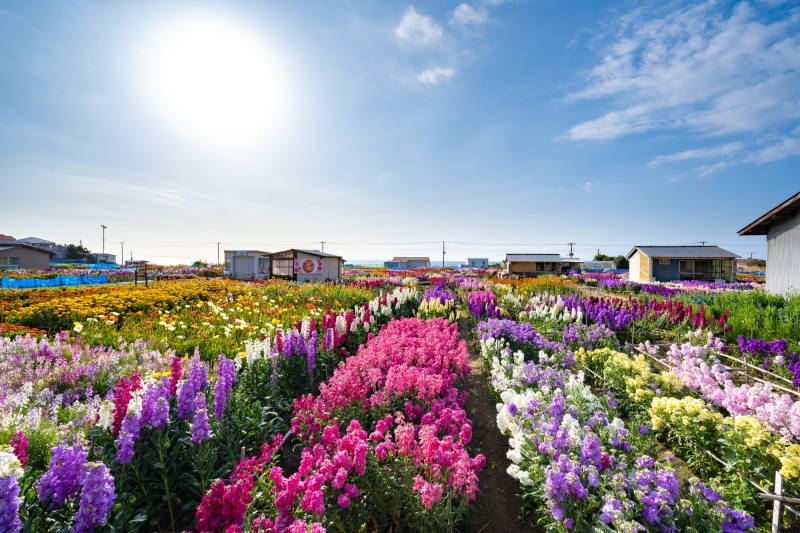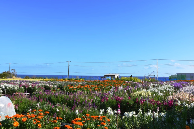 冬でも比較的暖かい房総半島の穴場ドライブスポット。南房総市千倉町の白間津(しらまづ)地区、国道410号線沿いに広がる花畑です。こちらでは1月〜3月にかけてポピー、キンセンカ、キンギョソウ、ストックなどの花が色とりどりに咲き誇り、花摘みを楽しむことができます。海を眺めながら花摘みを楽しめるなんて、白間津ならではの体験ですね。