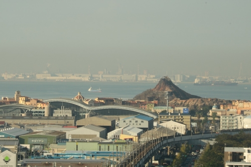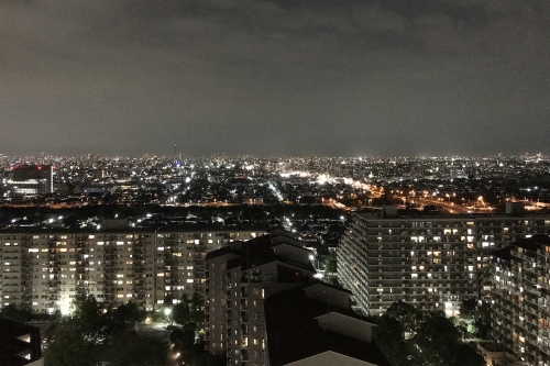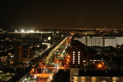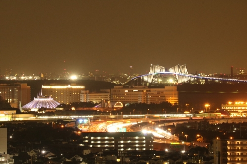 夜になるとプロメテウス火山は少し見えにくくなってしまいますが、舞浜方面に続く大きな一本道と遠くにはみなとみらいの夜景を見る事ができます。