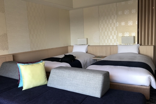 「水鏡」は、2018年2月1日に最大4名迄泊まれるファミリータイプの部屋としてリニューアルされた部屋。部屋に入ると扉のないオープンな造りになっていますが、格子状のパーテーションがベットルームを目隠ししているので、ベットルームと玄関口の空間は区切られています。