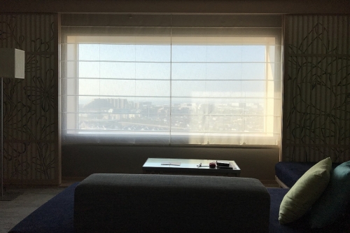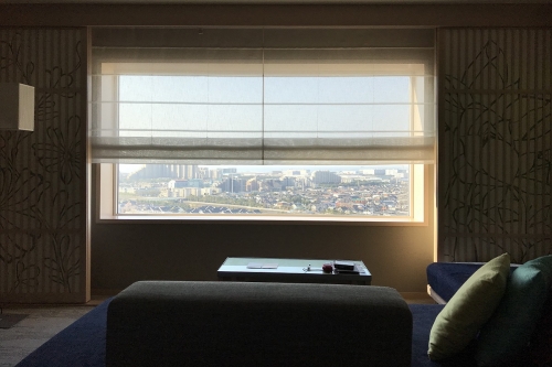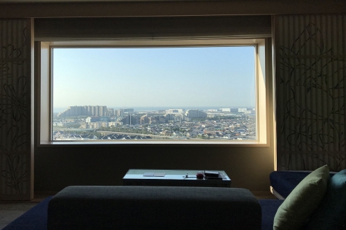 今回ご紹介するのは、20階のThe Foolr PREMIUM DOORSにある「ルーム・水鏡」。エレベーターを降りるとエレベーターホールにカウンターテーブルと椅子があり、外の景色を楽しむ事ができます。写真ではわかりづらいですが、ここから東京スカイツリーも見られます。