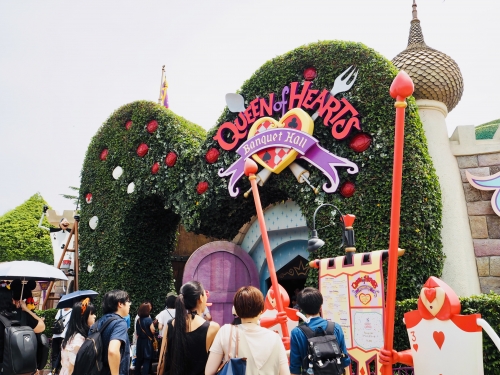 ディズニーランドにはバースデーケーキがあるって知っていますか?こちらは「クイーン・オブ・ハートのバンケットホール」というレストラン。不思議の国のアリスの世界観をモチーフにしたとってもかわいいお店です。