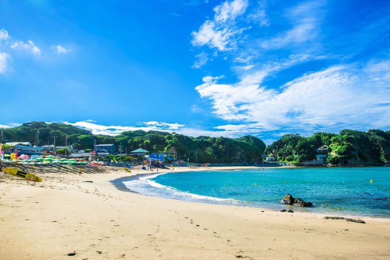 岩礁を借景にした風光明媚な景色も魅力で、ドライブで訪れるのにもおすすめ。千葉県屈指の透明度を誇る海として、海水浴シーズンは多くの人で賑わいます。