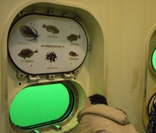 海上に出ている部分は展望塔全長24.4mのうち、3分の2で、残りは波の下に隠れています。館内最下層の展望室は、360度の壁面に24カ所の覗き窓があり、海中の景色を楽しむことができます。