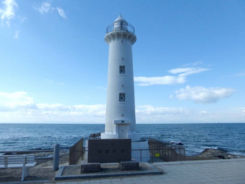 知多半島の西側、伊勢湾に面する野間灯台。青々とした伊勢湾の海をバックに佇む白亜の灯台で、空気の澄んだ天気の良い日には、対岸にそびえる鈴鹿山脈の山並みまで見渡すことができます。