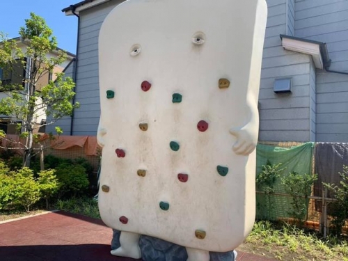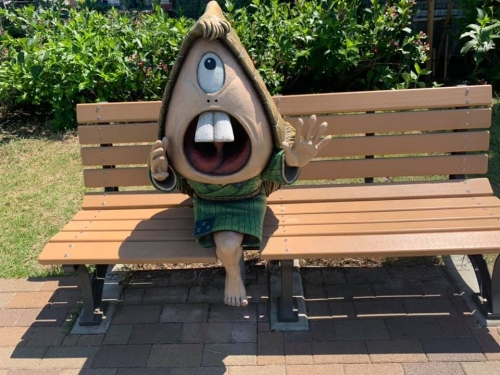 ベンチや東屋に溶け込むように座っているやまびこやぬらりひょん、一反もめんベンチやぬりかべクライミングなど、子供も大人も楽しめるオブジェや遊具がいっぱい!
