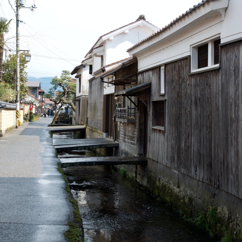 伝統的な町家づくりの商家と白壁の土蔵が玉川沿いに連なる、風情ある街並み。国の重要伝統的建造物群保存地区に選定されています。玉川に架かる、ゆるやかな反りを持つ一枚石の石橋も特徴的です。