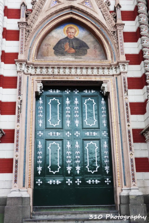 赤と白のしましま模様が全体に施されたなんとも奇抜で斬新なデザインで、今まで見たことのない衝撃的な外観に圧倒されます。また入口にも素晴らしい宗教画が施されており、こちらの重厚で鮮やかな緑色の扉を開けると、中も同じく赤いしま模様に統一されています。