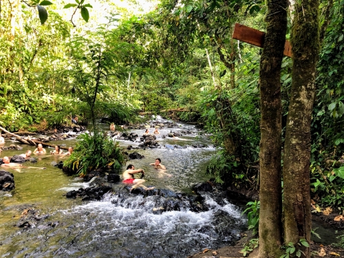 地元民からも観光客からも愛されるローカルスポットとなるのが「タバコン川天然温泉」。なんと川そのものが温泉という贅沢な場所で、コスタリカのトロピカルジャングルの中でゆったりと露天風呂を楽しめます。荷物をまとめたら、そのまま担いで自分が落ち着きたい場所まで移動します。川の中は岩が多いため、ウォーターシューズなどの着用がおすすめです。トイレや脱衣所などはなく、まさに自然のままの温泉となります。置き引きなどもありますので、必ず自分の目が届く場所に荷物をまとめて置くようにしましょう。