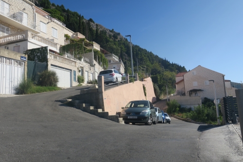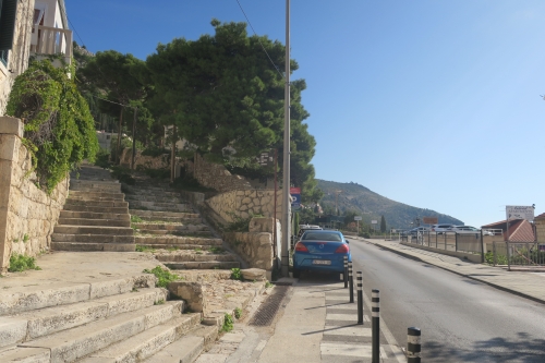 スルジ山行きのロープウェイ乗り場の前の道路を、空港方面に進んで行きます。少し歩くと、階段(写真左)があるのでそこを登っていきます。階段を登り終えるとしばらく坂道になりますが、そのまま進みましょう。