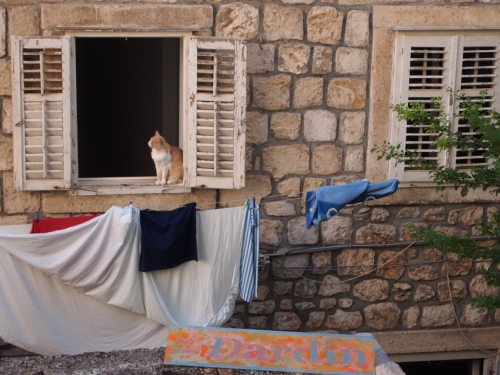 また、ドブロブニク含めクロアチアの各都市で街歩きをしていると、猫をよく見かけます。石造りの路地にひょこっと現れたり、洗濯物の上で日向ぼっこをしていたり、画になる愛らしい猫に出会えます。ドブロブニクは現在でも約3万人が暮らしているのですが、生活感溢れる路地にひょっこりと現れる猫、愛らしいですね。