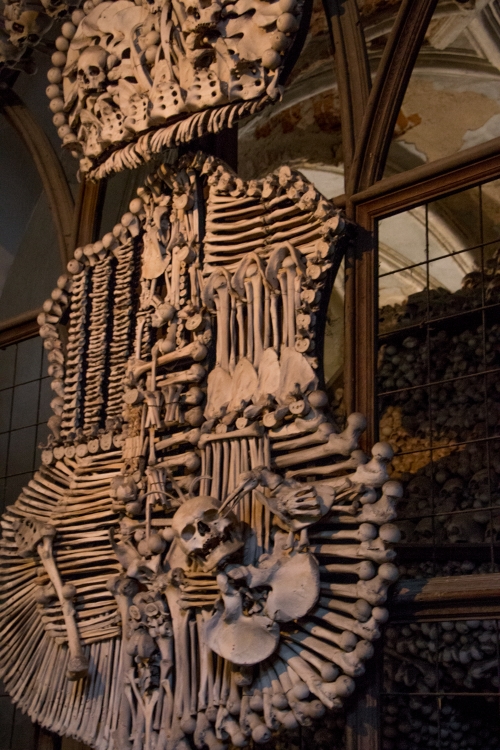 このユニークな内装の依頼主であるシュヴァルツェンベルク家紋章や、製作者のサインまでもがすべて人骨で作られています。