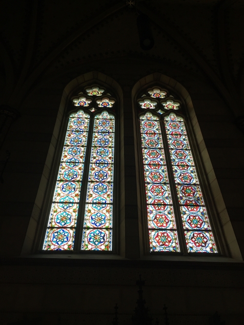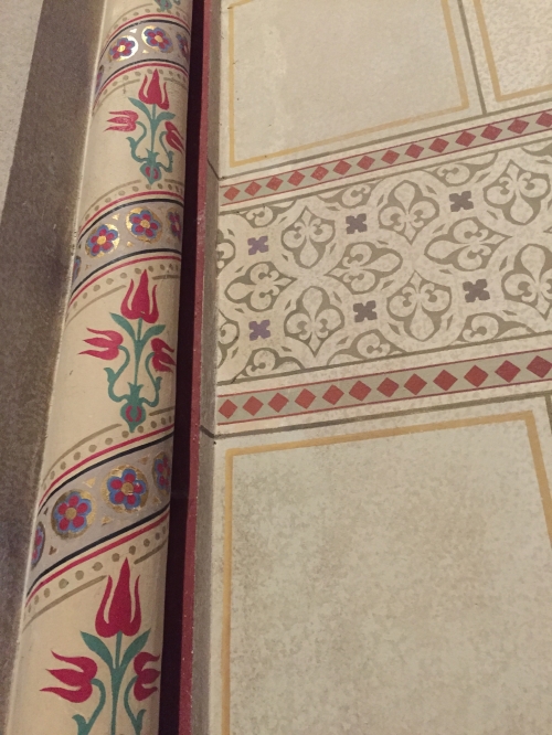 壁や柱のペイントが花柄になっており、非常に可愛らしいです。ステンドグラスの形も可愛らしく装飾されています。