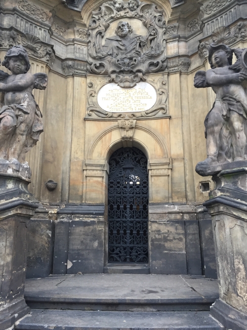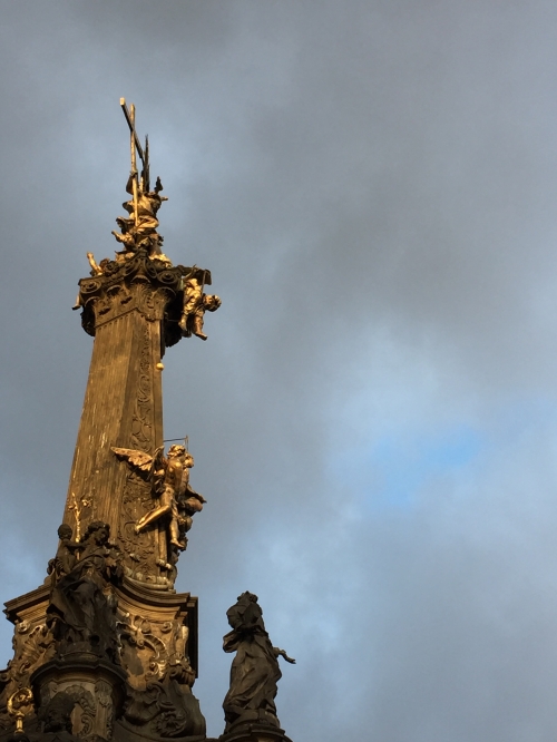 柱の頂点には神の美徳信仰、望み、そして愛が卵型の彫刻で具現化されています。また、下左写真、天使の上にある金色のボールは、1758年のプロイセン包囲攻撃の砲弾のレプリカとして飾られているそうです。