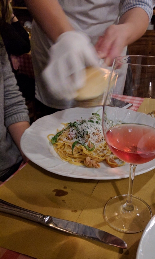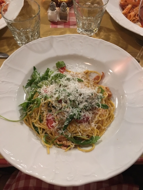 筆者が頂いたのはこちらのサーモンマリネとトマトのパスタ!パルメザンチーズは好きなだけかけてくれます♡シンプルながらもとても美味しかったです。