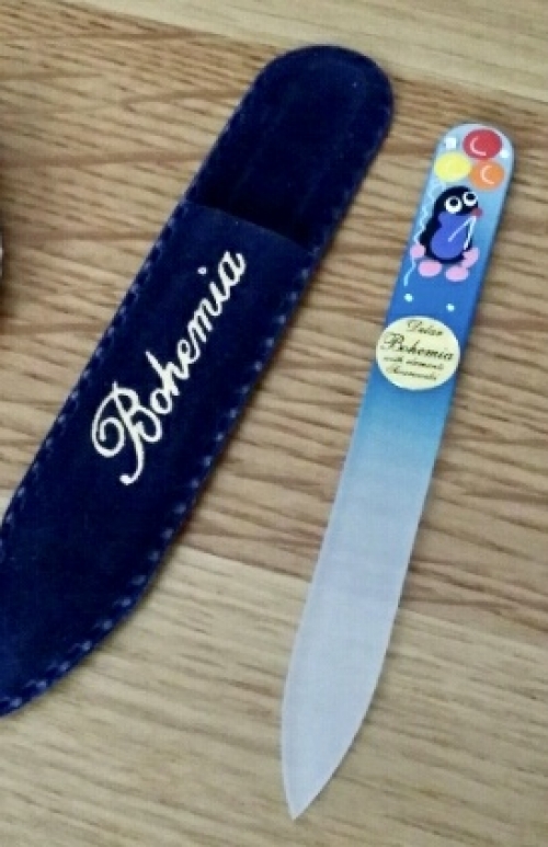 写真下(左)、チェコの伝統工芸品であるボヘミアンガラスのおしゃれな爪やすりも定番のお土産です。こちらはクルテクが描かれていますが、他にも大人っぽい様々なデザインがあり、高級感あるケースに入って約500~800円程です。