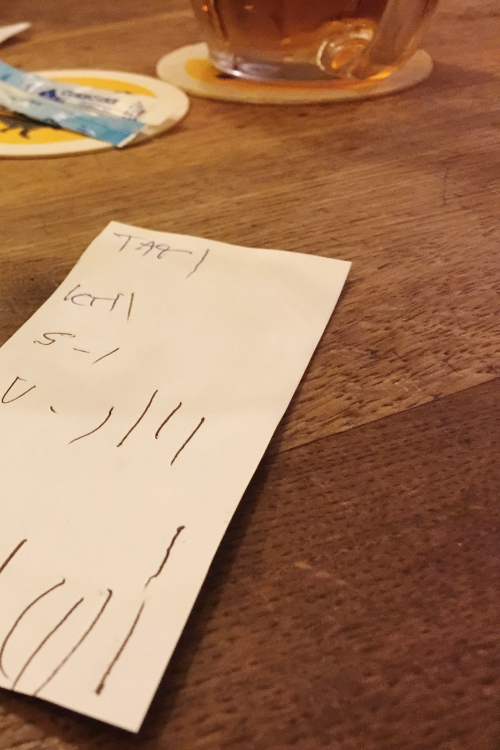 席に座ると店員が注文を取りにくるのではなく、目の前のコースターにだまってビールジョッキが置かれます。そしてビールが無くなると自動的に新たなジョッキが追加され、テーブル上の紙に飲んだ数の棒線が次々と引かれていきます。そのためちょっと休憩したいときは、コースターをフタのように乗せておくといいでしょう。