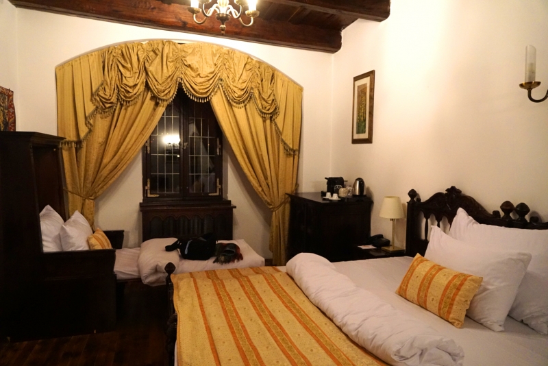 部屋に入ると木の家具とウインドウトリートメント(カーテン)が印象的な、落ち着いた空間が広がっています。クラシカルな雰囲気が好きな方はテンションがあがると思います。どの家具も、素敵な彫りが施されていて、凝ったデザインです。ベットは、マットが高い位置にあり、少し固めでした。