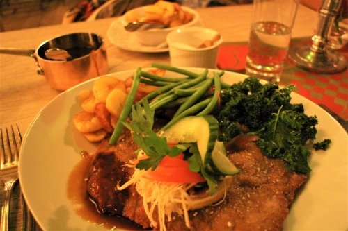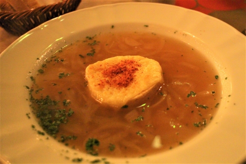 食べられるお料理は、オニオンスープ、日本のとんかつのようなポークを平たくして揚げ、野菜やじゃがいもを付け合わせた料理など。塩加減が薄味で旨みもあり、日本人の口にも合います。