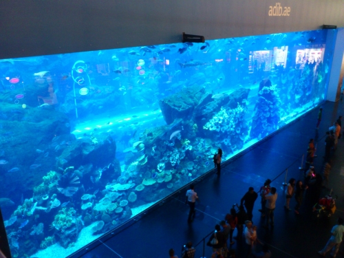 そしてこのモールには「ドバイ水族館&水中動物園」が併設されています。その入り口にはこんなに大きな水槽が。ギネスにも登録された世界最大の水槽で、なんとこの一枚でできたアクリルパネルは日本の会社が製造したものです。