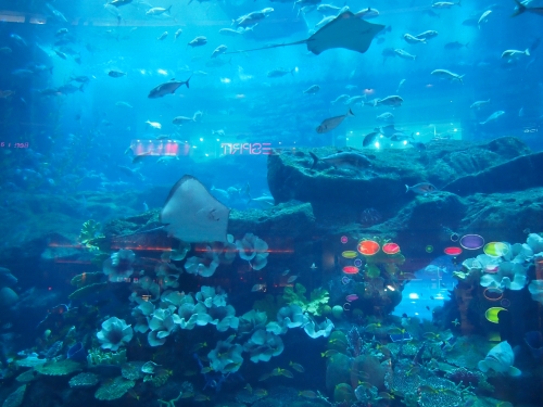 水槽はモールに面しているので、買い物客が自由に見ることができます。迫力ある水槽に圧倒されながらも、エイやサメ、可愛いお魚達が優雅に泳いでいて和みます。