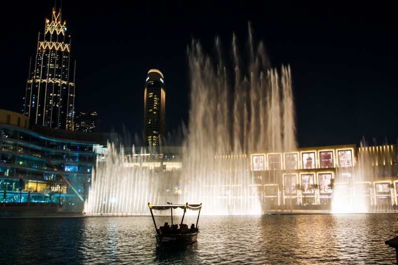 ドバイモール、ブルジュ・ハリファ、スーク・アル・バハールを囲むように大きな人工の池があり、そこでは毎夜「ドバイ・ファウンテン」という噴水ショーが開催されます。もちろん無料で観覧することができ、観光客に大人気です。