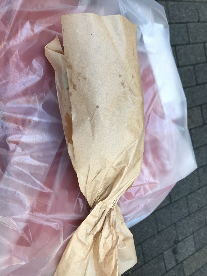手早く作ってくれたバインミーは、ベトナムの街角で作られたのかと思わせるような紙での包装!