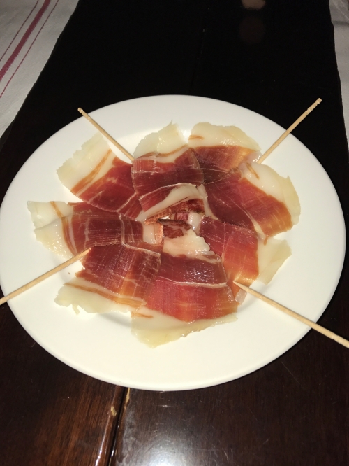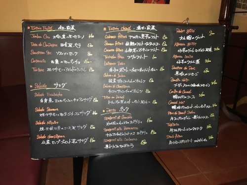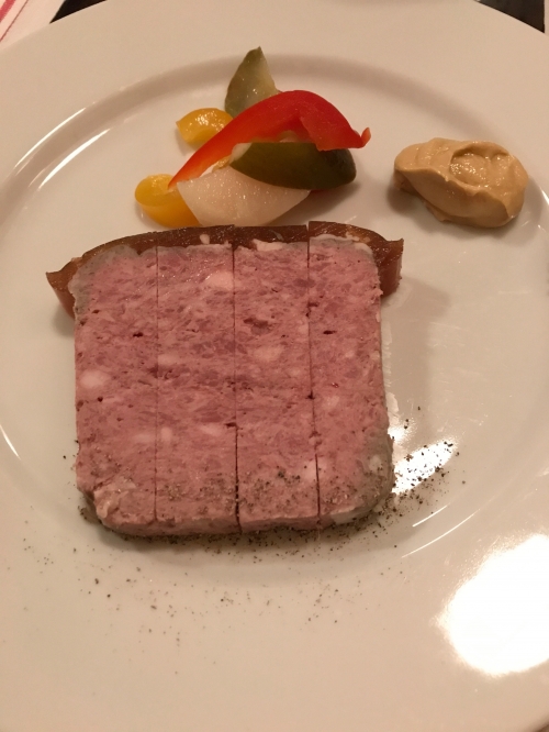 先ずは、スペイン産の生ハムとワインを頂きながら、前菜選び。前菜で人気は、何と言ってもシェフ自慢の田舎風パテ。パテは、まずはそのままで頂き、口の中にパテの旨味が広がるのを楽しみましょう。次にパンと一緒に頂けば、お腹にもたまる一品。