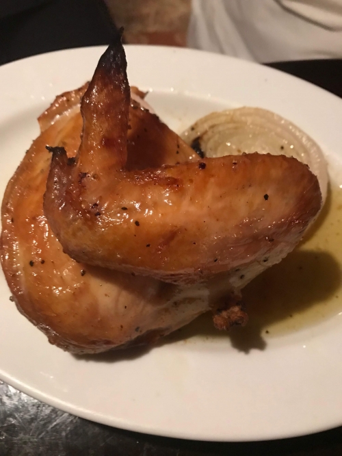 オーナーの地元である広島三原育ちの神明鶏を使った、肉汁焼き(¥1,480)は、250度で27分じっくり焼き上げるので、外はパリパリ、中はジューシーなローストチキン。チキンと一緒に焼かれた甘みたっぷりのオニオンと大きなチキンを、お店の人が見事な手さばきで、食べやすいサイズに目の前でカットしてくれるんです。