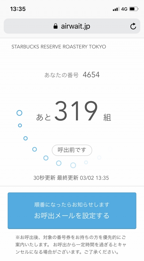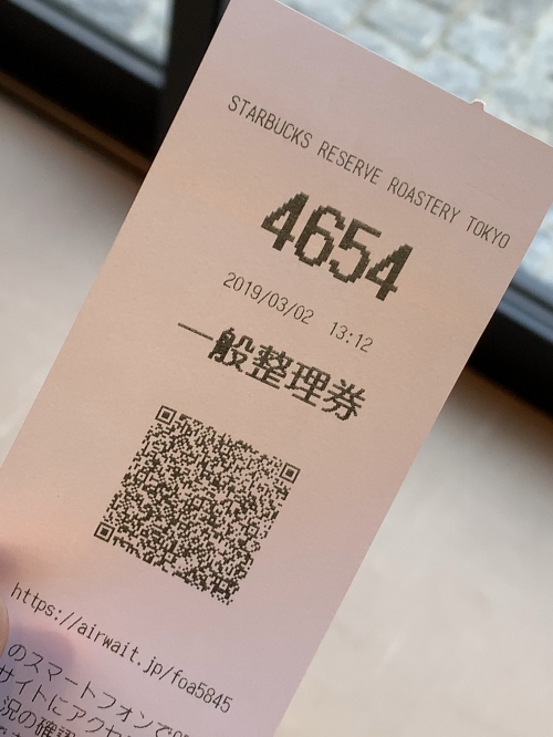 「スターバックス リザーブ ロースタリー 東京」は、開店直後に一般整理券を配布しています。1人、1枚のみ発券可能です。スマートフォンでQRコードを読み取ると、何組が待っているのか確認することができます。入店可能の連絡の後は、22時までは入店可能ですが、一定時間を越えるとキャンセル扱いになってしまう場合もあるので、注意が必要です。