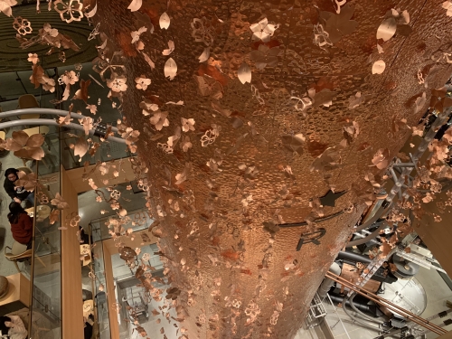 敷地面積は1200㎡もの広さを誇る、「スターバックス リザーブ ロースタリー 東京」。世界的建築家・隈研吾氏が設計を手がけ、杉を使用した温かみのあるおしゃれな外観。内装のインテリアも、目黒川沿いの桜をイメージされた、銅板を鍛金して作られた桜をふんだんに使った、日本を感じさせる店舗となっています。