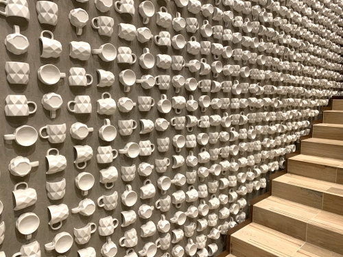 「スターバックス リザーブ ロースタリー 東京」の壁面にも注目して下さい。幾何学的なコップが埋め込まれていたり、パッケージのデザインがレイアウトされたりと、オシャレでカラフルなインスタ映えスポットが満載ですよ。