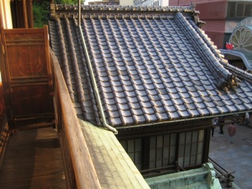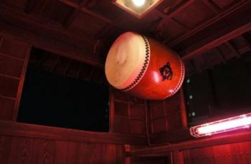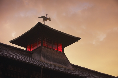 振鷺閣は、赤い西洋製のギヤマンと呼ばれる色ガラスがはめ込まれた太鼓楼で、特に夜になると赤く浮かび上がって幻想的です。振鷺閣に置かれた刻太鼓は、開館時間の6時・正午・18時に打ち鳴らされます。昔懐かしい音がしますので、時間が合えば是非お聞きくださいね。