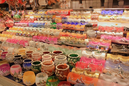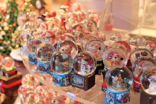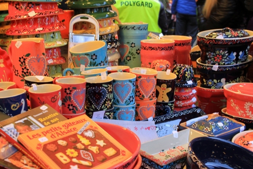 アルザス地方の郷土料理「シュークルート」用のお鍋やマグも手書きの柄が可愛らしくてマルシェらしい品物。手頃に買えるスノードーム(5ユーロ:650円程度)は地名入り+サンタクロースのデザインも多いのでお土産にも最適。