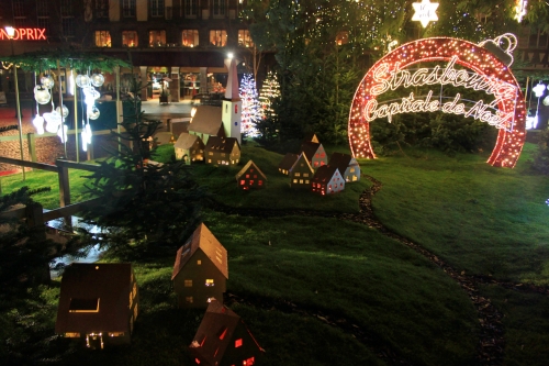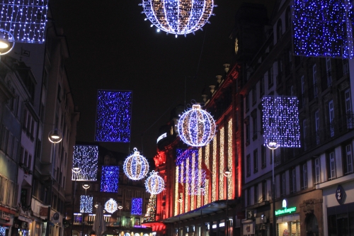 夜になると昼間の可愛らしい雰囲気とはまた違う、幻想的な街並みに。街のあちこちに設置されている小型の移動遊園地もライトアップされて、ちょっとしたお祭りのような賑やかさです。クレベール広場にあるフランスの大型百貨店、ギャラリーラファイエットももちろんクリスマス仕様。入り口正面には大きなツリーが飾られていて迫力も抜群です。