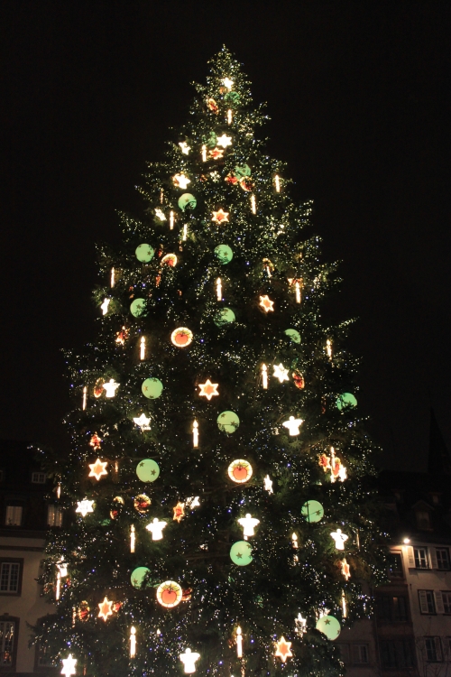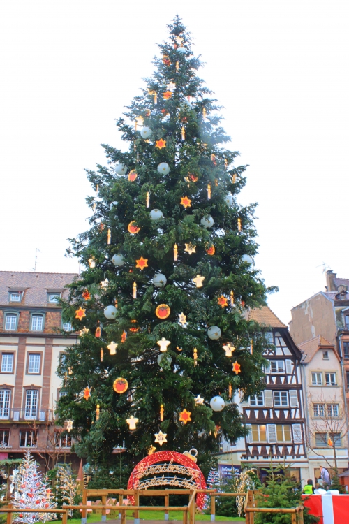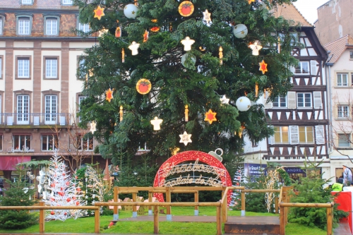 ストラスブールは実はクリスマスツリー発祥の地。だからこそ街の方達も「ストラスブールのクリスマスは世界一!」と口々に教えてくれます。今ではクリスマスの代名詞とも言えるクリスマスツリー。先述のクレベール広場に飾られているクリスマスツリーは、さすが発祥の地だけあってその巨大さに驚きます。そして、昼と夜ではまた違う印象をになります。淡い緑と黄色のオーナメントが昼間はポップに、夜は幻想的に街を彩ります。