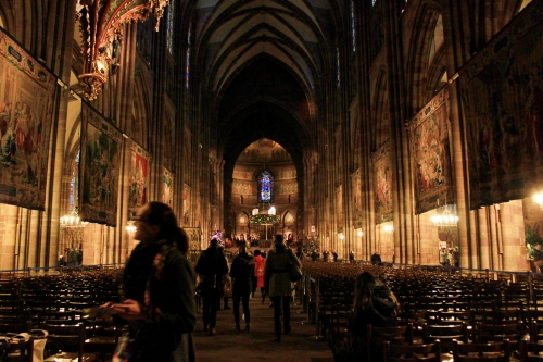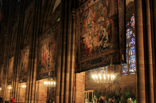 ぜひ訪れて欲しいのが街のシンボル、ストラスブール大聖堂です。写真からもわかる通り、正面に聳える塔の高さには目を見張ります。143mに及ぶ塔の高さは長い間キリスト教会の中で最も高い塔としてその地位にありました。そしてクリスマスシーズンは教会内部までクリスマスの飾り付けが行われています。荘厳な雰囲気の中で、シンプルな装飾が一際美しく映えます。