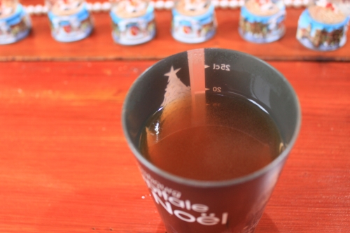 そしてこれぞ、マルシェ・ド・ノエルの醍醐味・ホットワイン。赤・白どちらもあります。数種類のフルーツシロップとシナモンの香りで体を温めるのに最適。ノンアルコールとしてホットアップルジュースも。