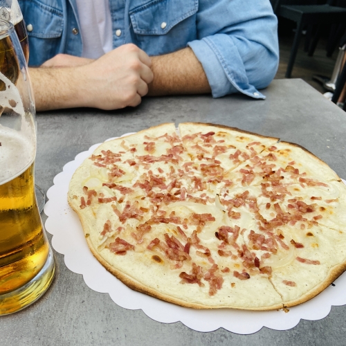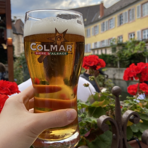 もちろんコルマールを訪れた際は、この地方のアルザス料理を堪能することもお忘れなく。どこのお店にもアルザス風のピザフラムクーヘンが定番で置いてあり、それに合わせてコルマールの地ビールやアルザスワインをいただけます。