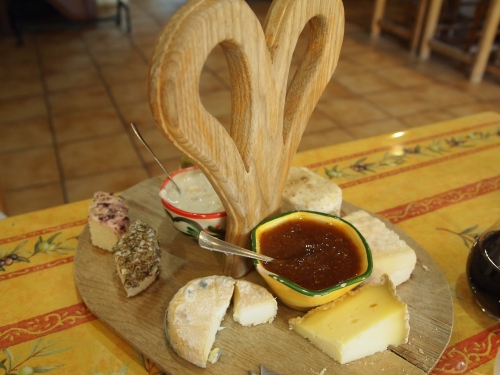 筆者オススメの農家レストラン「Le Mas des Vertes Rives」では、食前酒・前菜・メイン・チーズ・デザートと、コースでお料理が食べられます。フランスの田舎の味はどれも素朴でとても美味しいです。ヤギのチーズにジャムをつけて召し上がれ。