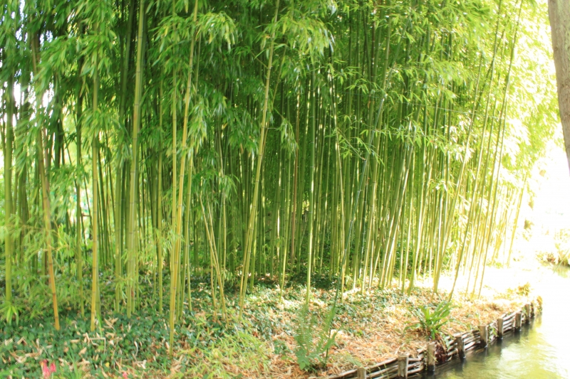 竹林を抜けると、いよいよ睡蓮の浮かぶ池が見えてきます。日本の太鼓橋を思わせる緑色のアーチ状の橋の上部には藤棚が茂り、花の咲く季節には紫色の藤の花が橋を彩ります。