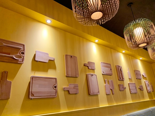 ベージュ系のカラーリングで統一された店内ですが、片側だけ大柄の葉っぱの壁紙が。しかもよく見ると小鳥が隠れていたりして女性にはたまらないおしゃれな空間です。