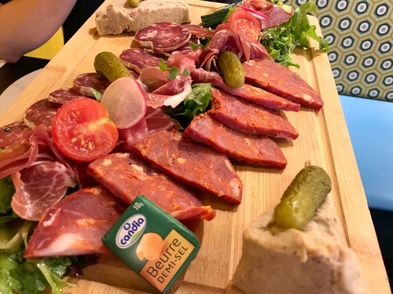 友達や家族同士なら、乾杯とともにこのハムの盛り合わせを注文してほしいところ。フランスでは料理がゆっくり運ばれてくるので、こういう盛り合わせのおつまみを楽しみながら待ちましょう。