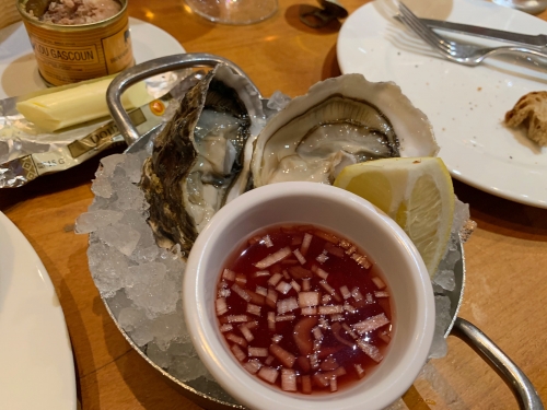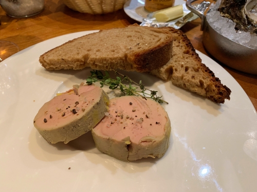 ワインビネガーと玉ねぎのソースに、レモンをキュッとしぼった生牡蠣も最高。白ワインにぴったりの逸品です。こんなに贅沢なフォアグラも19ユーロ(約2,280円)で食べられちゃいます!