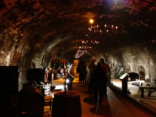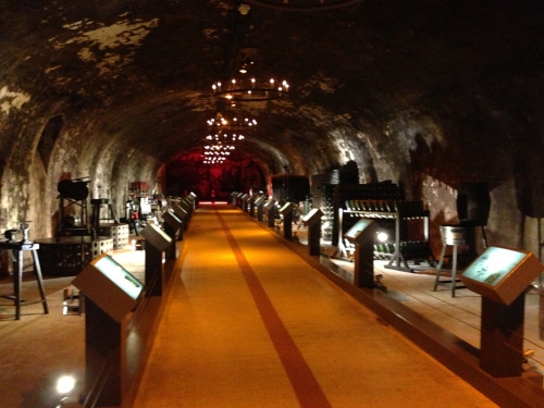 ツアーの終盤はシャンパン製造に使う道具やボトルなどの歴史が説明付きで、センスよく展示されています。暗い洞窟のようなカーブ内でのライトアップでの展示は、大変お洒落に感じますね。